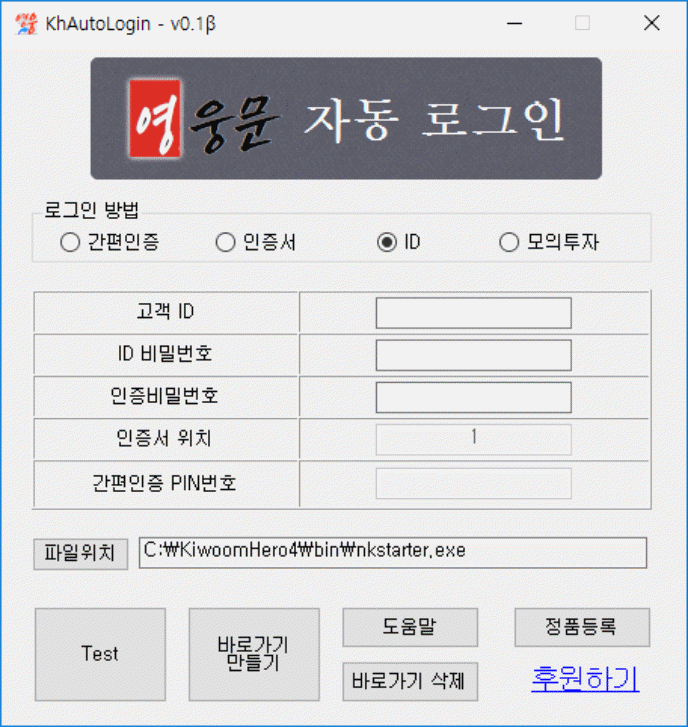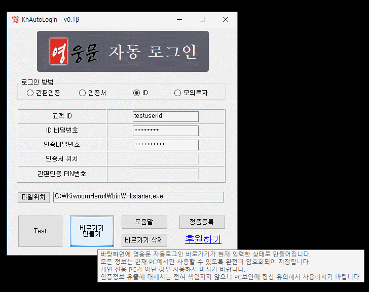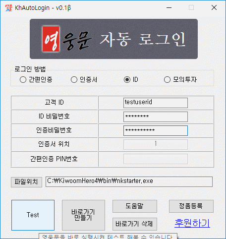 3. 로그인 계정 정보를 입력하고 , Test 버튼을 누르면 자동 로그인 기능이 잘 동작하는지 확인 할 수 있습니다 . 영웅문을 기본 설치 위치와 다른 폴더에 설치한 경우 , " 파일위치 " 버튼을 눌러 nkstarter.exe 파일이 있는 위치를 지정해 줍니다 .